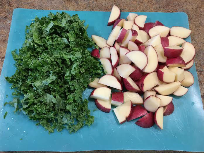 Wash and dice potatoes into bite sized pieces. Give kale a rough chop and set aside.