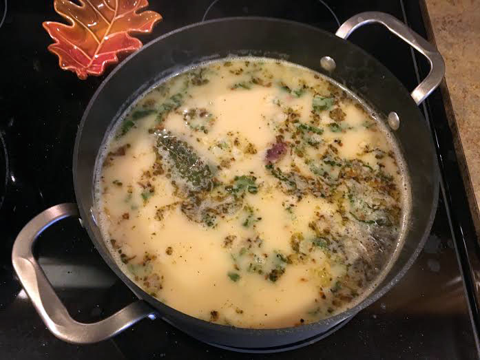 When it begins to boil, add potatoes and kale. Give it a stir and set the timer for 10 minutes. Cook until potatoes are tender. When potatoes are done, pour in 1/4 cup of cream and give it a good stir. Allow about 1 minute for cream to heat through.